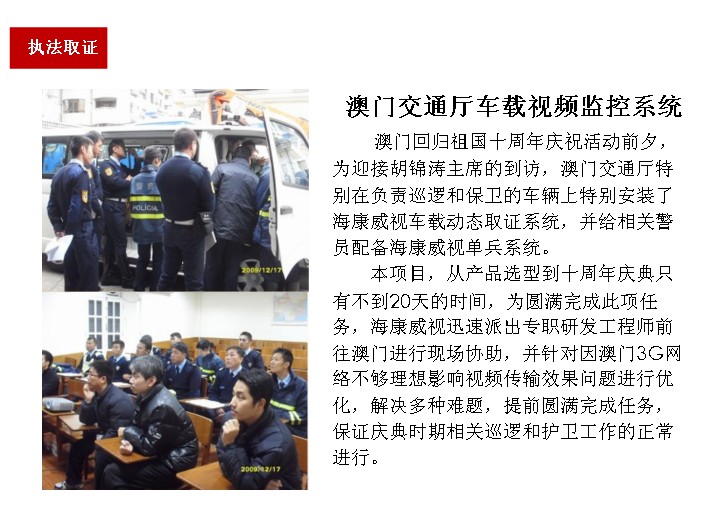 隨著無線傳輸技術(shù)和視頻監(jiān)控技術(shù)的快速發(fā)展,我公司經(jīng)過長期對行業(yè)的需求調(diào)研和應(yīng)用探索,完全自主研發(fā)了針對公安、交警、運(yùn)管、路政等部門的移動視頻監(jiān)控取證系統(tǒng)(移動圖傳),成為治安監(jiān)控和治安管理的有力補(bǔ)充。建設(shè)移動視頻監(jiān)控取證系統(tǒng),能將警力快速調(diào)動到一線,實(shí)時記錄執(zhí)法過程,實(shí)時指揮執(zhí)法過程,獲得完整有效的證據(jù),快速達(dá)到執(zhí)法目的,規(guī)范化整個執(zhí)法過程,真正意義上實(shí)現(xiàn)城市治安點(diǎn)面結(jié)合的實(shí)戰(zhàn)應(yīng)用需求,真正意義上與用戶業(yè)務(wù)需求緊密結(jié)合,滿足用戶實(shí)戰(zhàn)需要。
